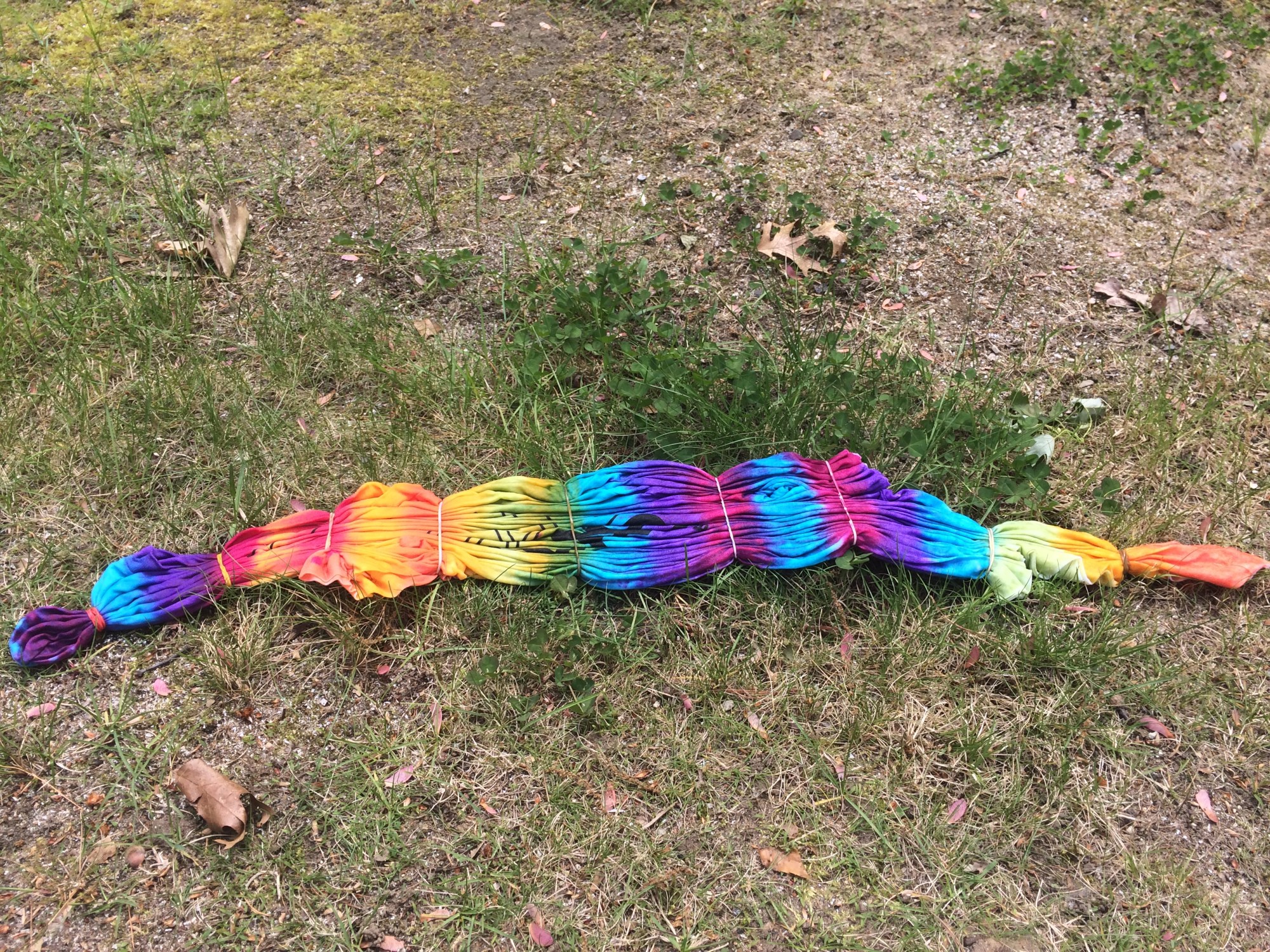I used red, orange, yellow, lime green, turquoise and purple dyes, and applied them in random order on both sides: